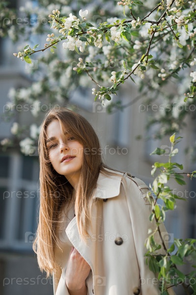 Красивая девушка в длинном бежевом плаще греется на солнышке 2977