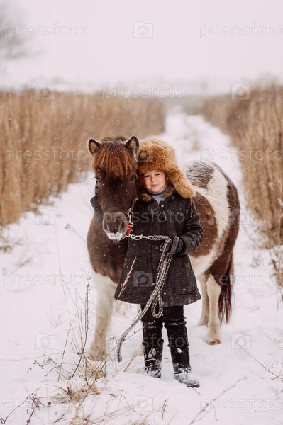 Двухцветный пони и ребенок идут по снежному полю 3090