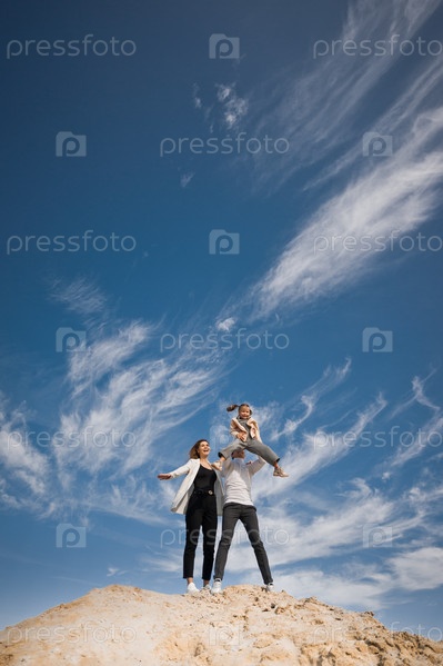 Семья позирует, стоя на песчаной горе на фоне неба 3311