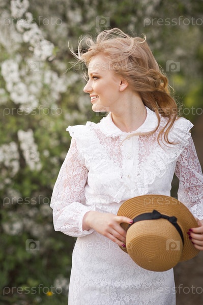 Девушка в белом платье с кружевами и соломенной шляпкой в руках 2676