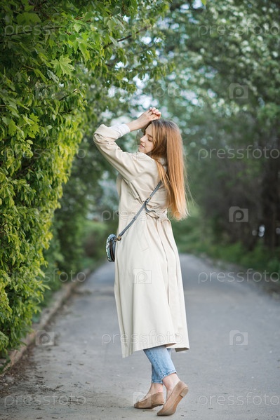 Радующаяся весне девушка крутится в туннеле из зеленых кустов 2986