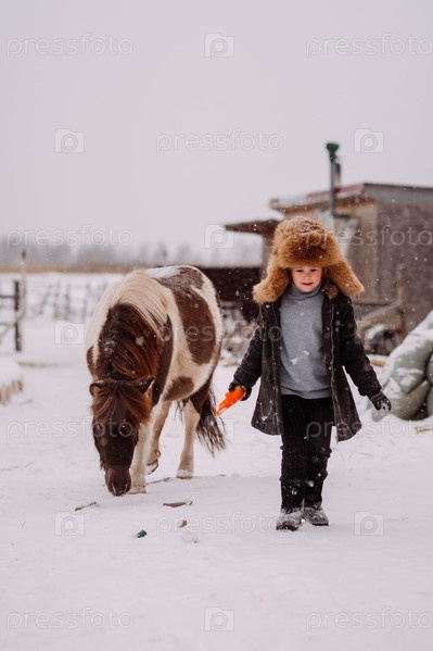 Процесс кормления пони во дворе конюшни 3116