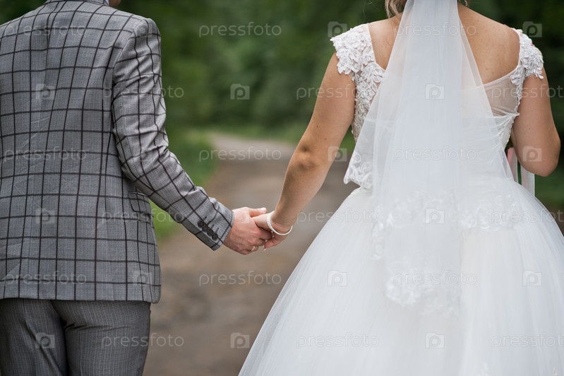 Жених и невеста, взявшись за руки, уходят вдаль 3139
