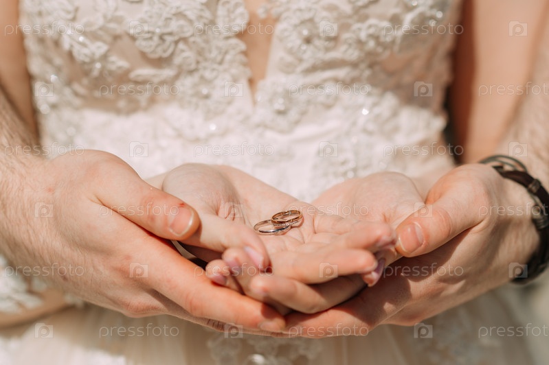 Нежные объятия рук молодоженов с обручальными кольцами 3177