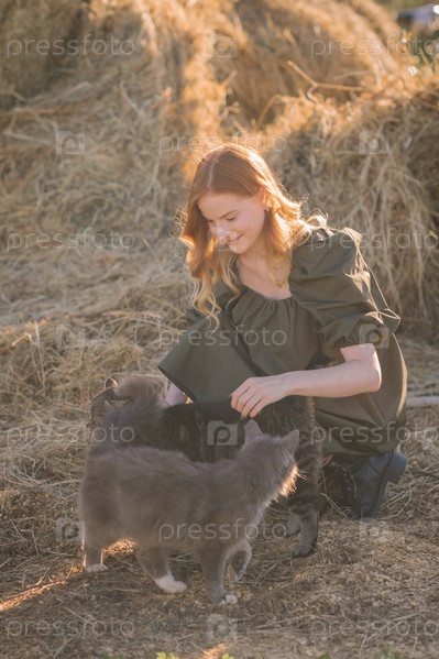 Девушка гладит деревенских кошек возле конюшни 3266