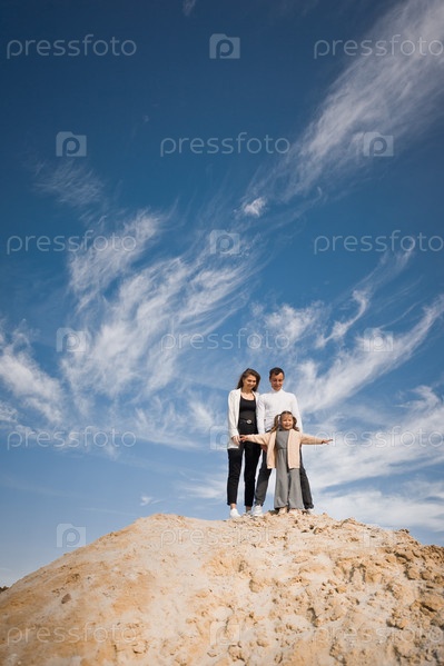 Семья позирует, стоя на песчаной горе на фоне неба 3310
