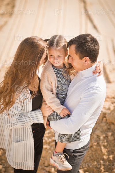 Молодая семья с дочерью среди песка и голубого неба 3306