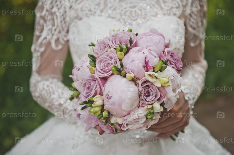Невеста стоит в саду и держит в руках яркий свадебный букет из пионов и роз 2669