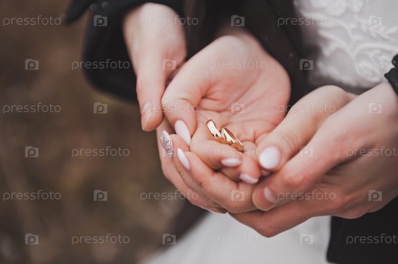 Золотые обручальные кольца на ладонях жениха и невесты 2661
