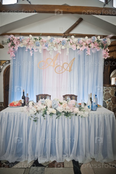 Праздничное место для молодоженов, украшенное тканью и цветами 2767