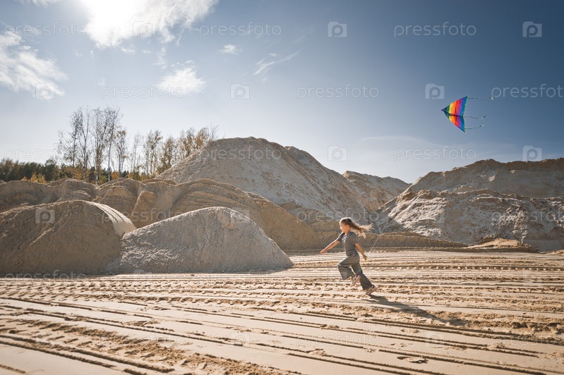 Ребенок играет с воздушным змеем на песке 3342