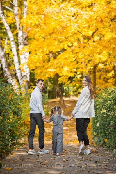 Папа, мама и дочка гуляют в осеннем лесу 3391