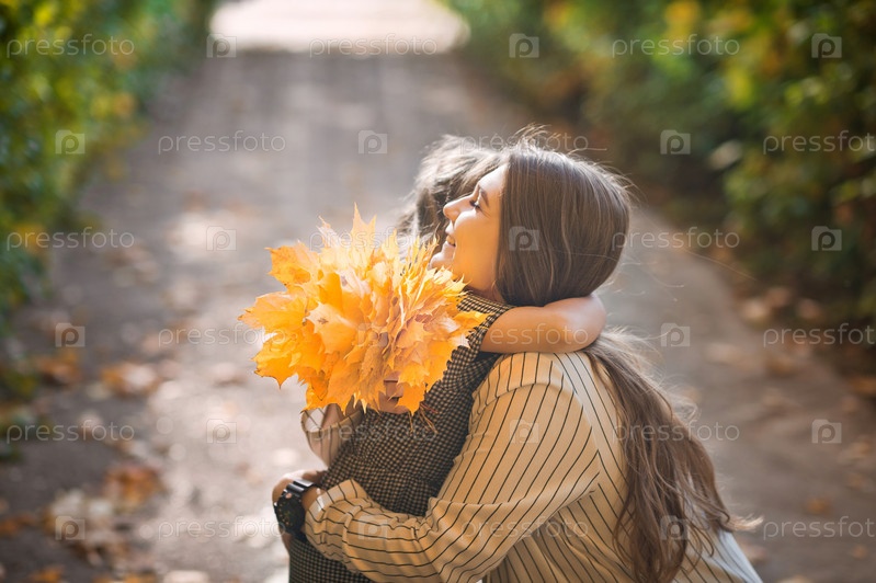 Большое фото мамы и дочки осенью с желтыми листьями 3379