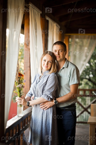 Муж и жена обнимаются, стоя на террасе дома 3464