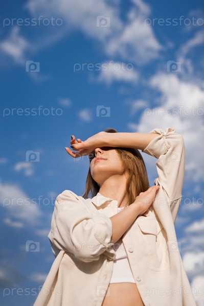 Портрет молодой девушки на фоне ясного неба и небольших облаков 3698