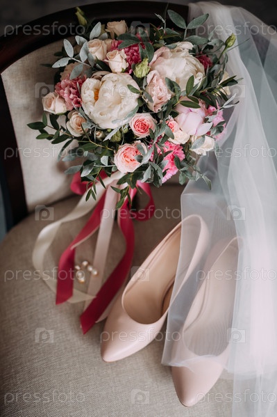 Букет, туфли и украшения невесты на стуле 3788