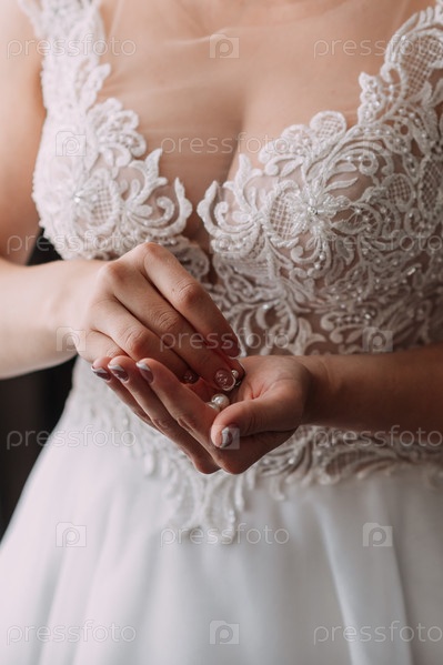 Невеста в ажурном платье держит в руках ожерелье 3794