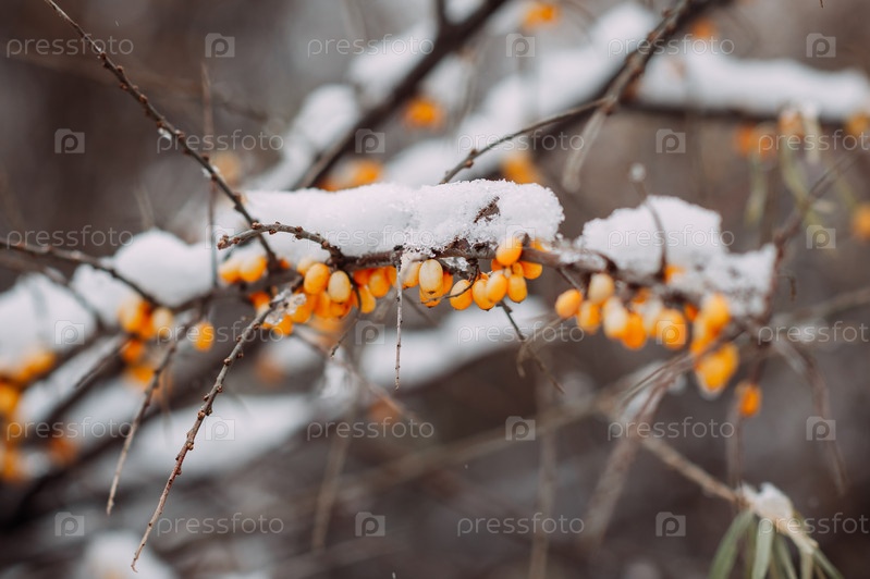 Облепиха – растение после снегопада с белыми сугробами на ветвях 4372