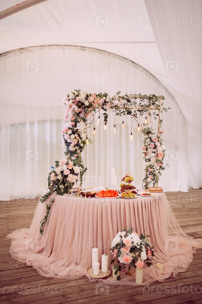 Свадебный президиум для жениха и невесты, украшенный цветами 4394