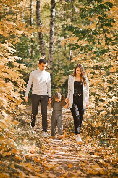 Папа, мама и дочка гуляют в осеннем лесу 3366