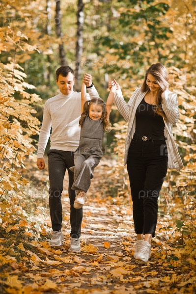 Папа, мама и дочка гуляют в осеннем лесу 3367