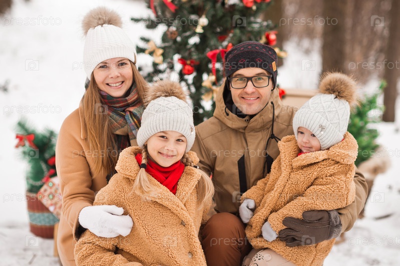 Новогодняя открытка семейное фото с елкой на природе 3522
