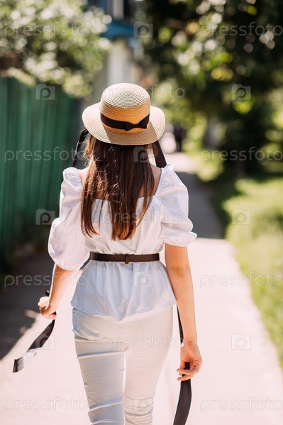 Молодая девушка в шляпке на фоне цветущих улиц города