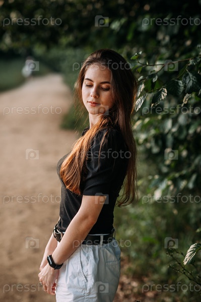 Радостная красавица гуляет в лучах заходящего солнца на природе 3665