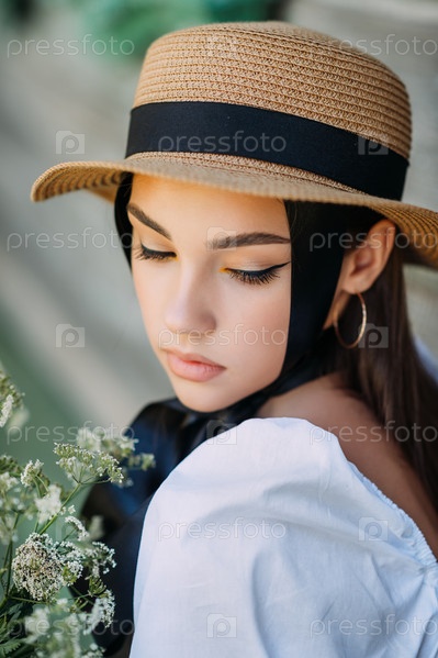 Большой портрет девушки в соломенной шляпе и с черными лентами 3589