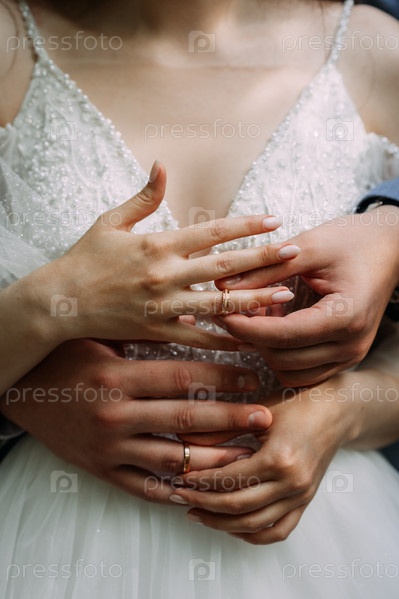 Переплетение пальцев молодоженов обручальными кольцами 3842