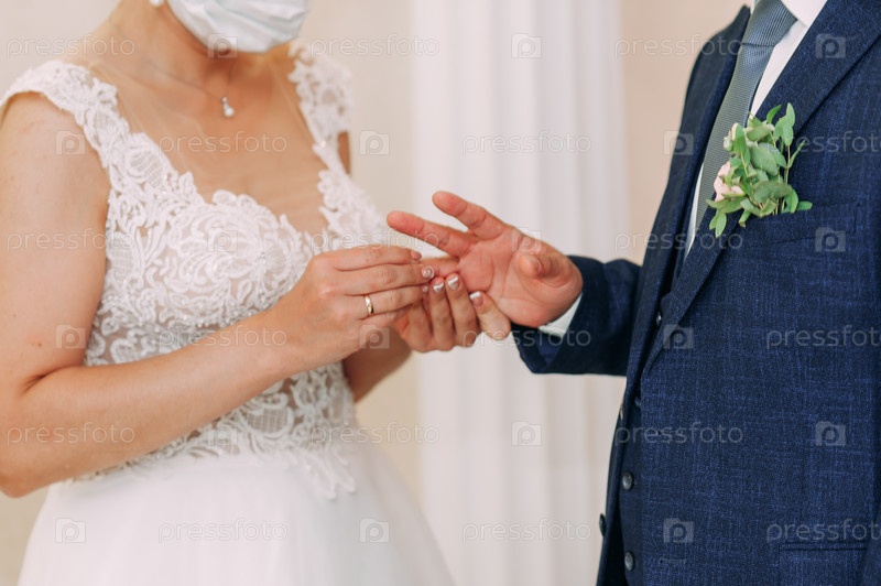 Жених и невеста в медицинских масках обмениваются кольцами 3835