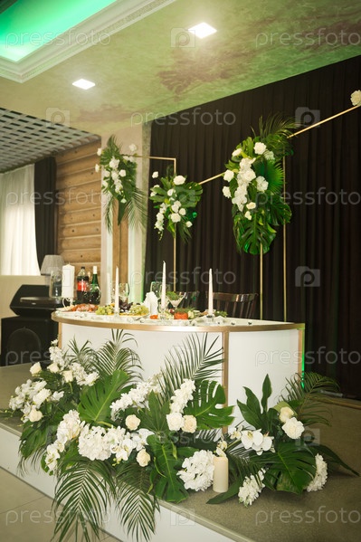 Главный стол молодоженов на свадьбу украшают белилами