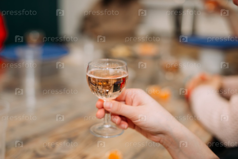 Бокал шампанского в женской руке за столом 4280