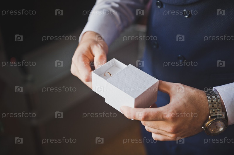 Открытая коробка с обручальными кольцами в руках жениха 2620