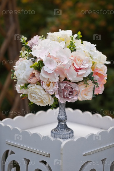Букет роз на подставке как украшение свадебной территории 32