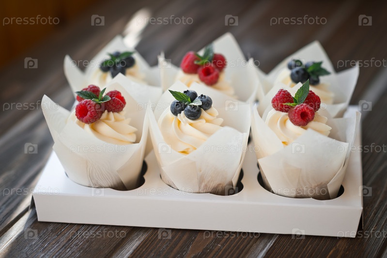 Шесть кремовых пирожных, украшенных ягодами, на подставке 3623