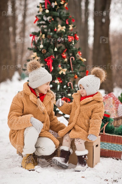 Дети играют с подарками рядом с украшенной елкой в зимний сно