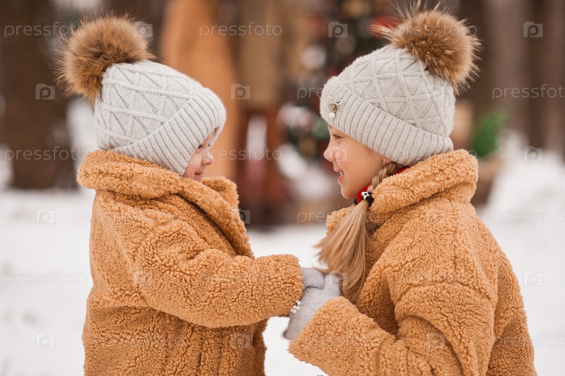 Старшая сестра гуляет с младшей по зимнему парку 3524