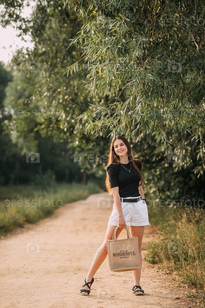 Девушка в черной футболке и с сумкой на ивовой аллее 3640