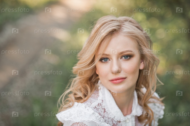 Красивый портрет девушки с голубыми глазами в белом платье в саду 2695