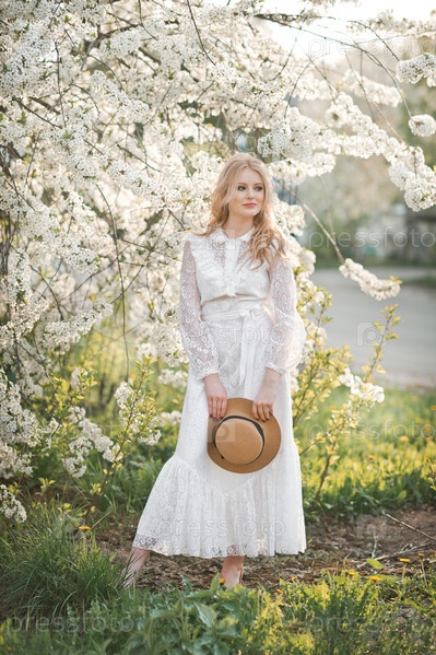 Красивая девушка в шляпке среди цветущих деревьев 2727