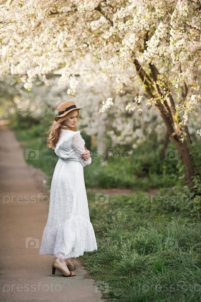 Девушка в белом платье идет возле цветущей сакуры 2706