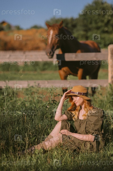 Рыжая красавица в шляпке отдыхает возле пасущихся лошадей 3239