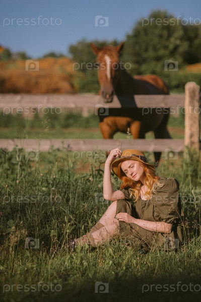 Рыжая красавица в шляпке отдыхает возле пасущихся лошадей 3238