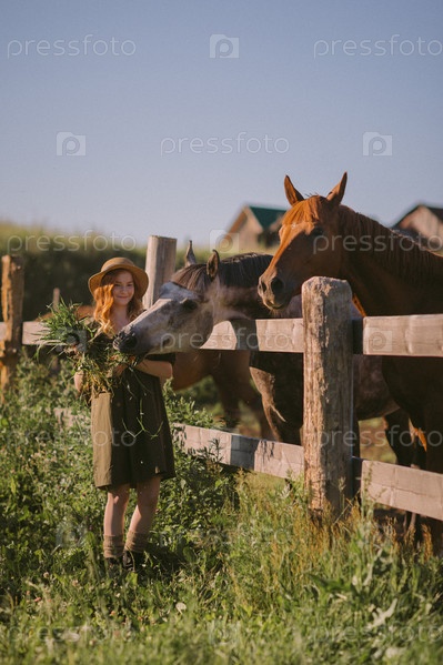 Девушка в зеленом платье гладит и кормит лошадей 3242