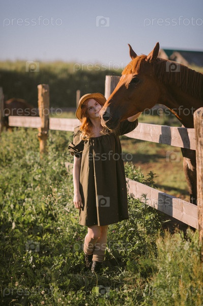 Девушка с рыжими волосами гладит и кормит лошадей травой 3245