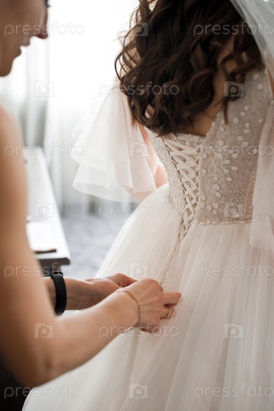 Друг повязывает свадебное платье на невесте 3982
