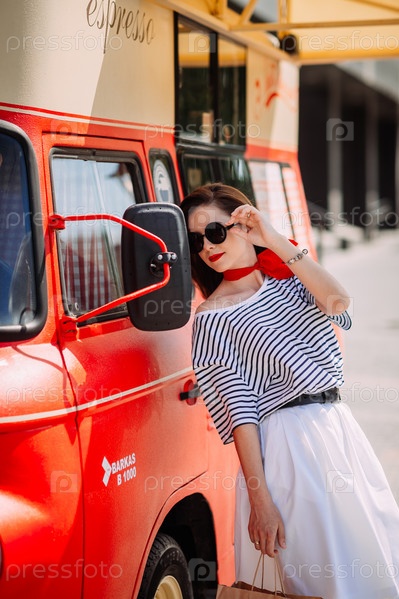 Фото задорной красотки на фоне красного фудтрака с гробом