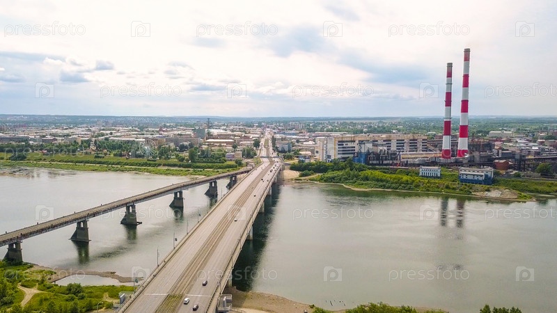 Кузнецкий мост через реку Томь. Панорамный вид на город Кемерово. Россия, Из Дрона