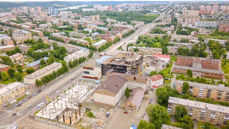 Вид на торговый центр после пожара. Кемерово, Россия, Из Дрона
